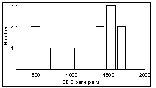 coding sequence (CDS) sizes (bp) of cDNAs deposited into the Genbank database,